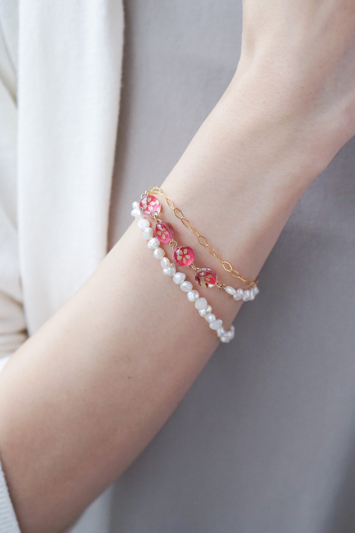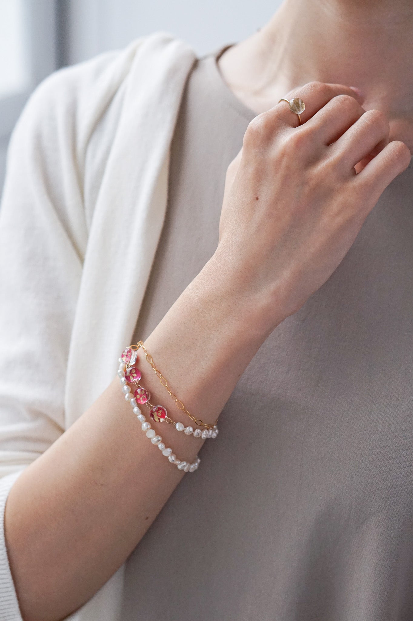 The bright and spring atmosphere is captured in the freshwater pearls that collect soft light and the colored Japanese paper beads.
