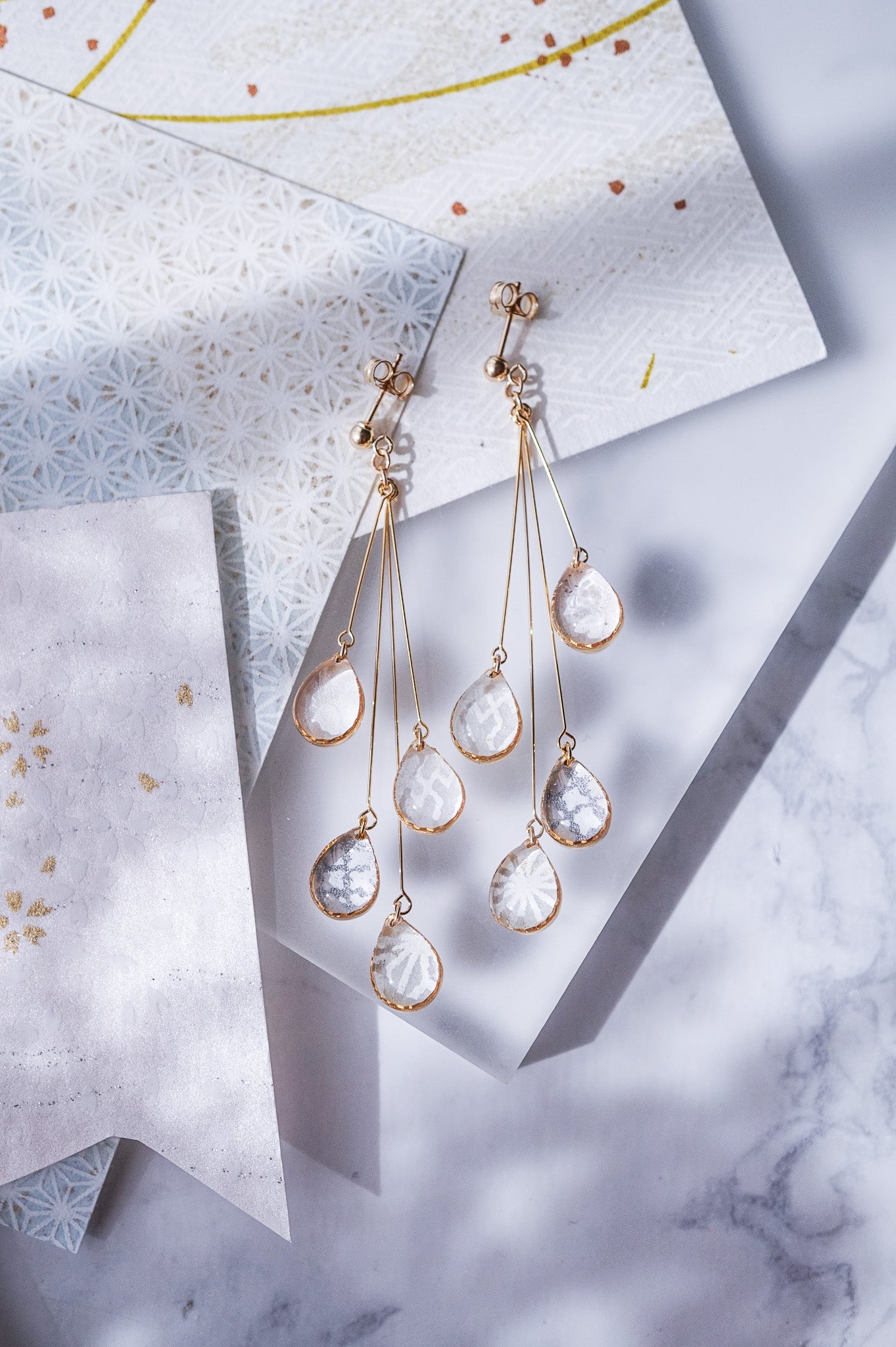 These adorable earrings sway with the image of a shower of blessings. The raindrops are made by encasing chiyogami paper in resin, and are finished in a round, glossy finish like candy.