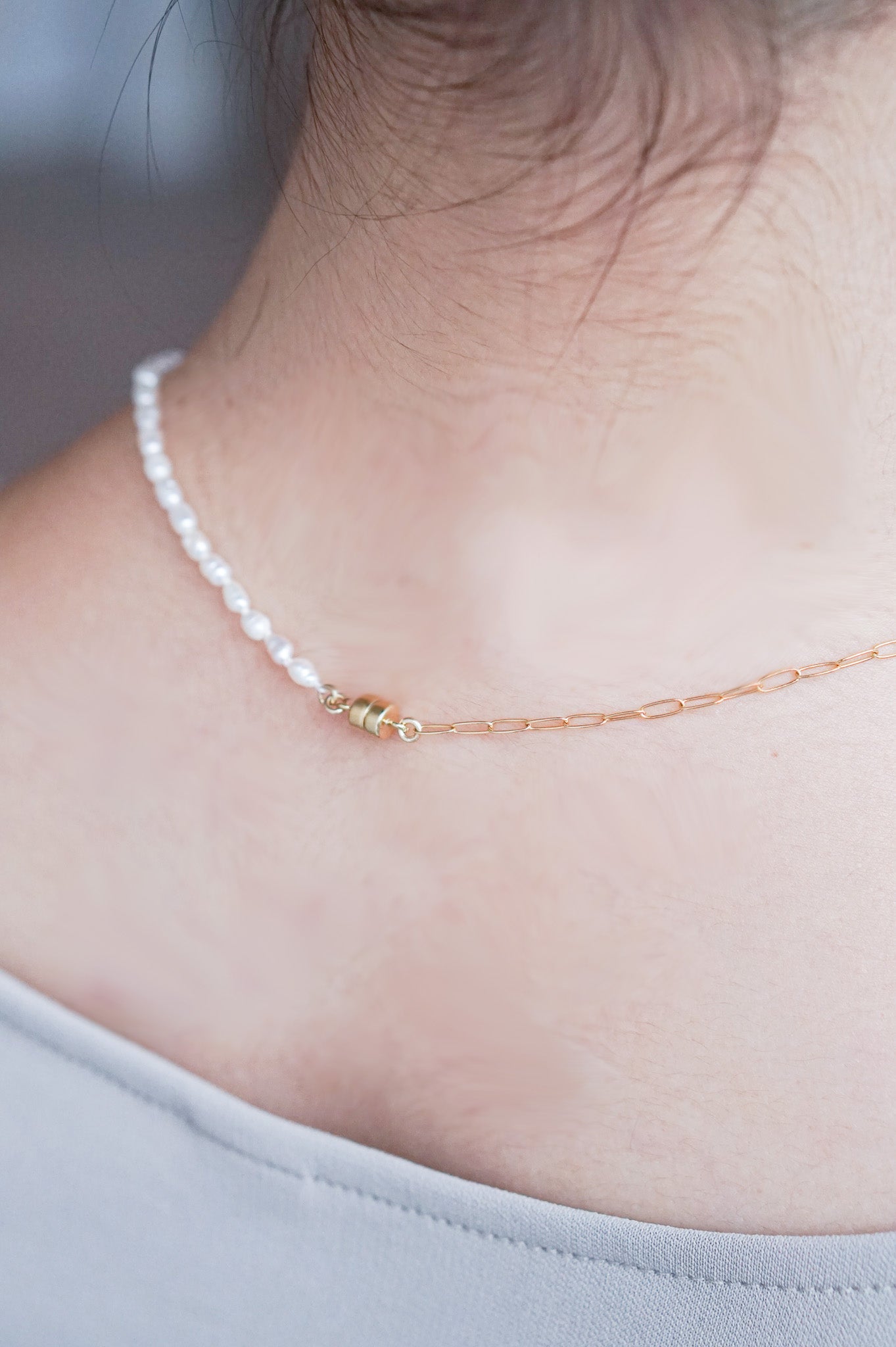 The clasp uses a magnet, making it extremely easy to put on and take off. You can put on the necklace in just one second, even on busy mornings.