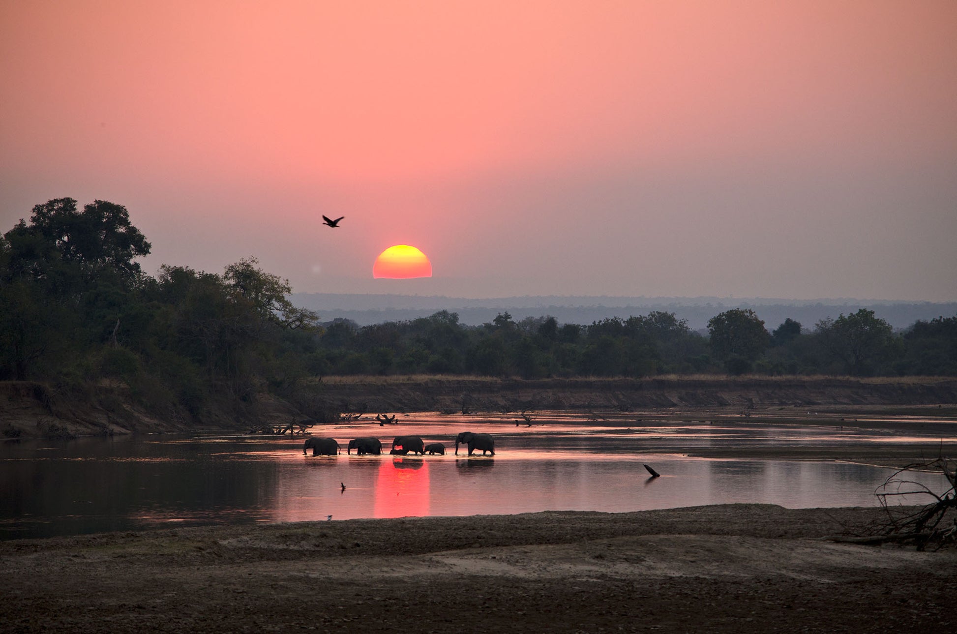 People drying banana fibers under a mango tree while happily singing, children smiling brightly with white teeth as they talked about being able to attend school, families of elephants crossing a river under the crimson sunset...